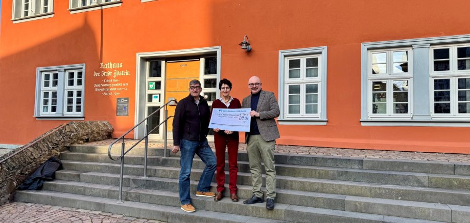 Sie frieren alljährlich für leuchtende Kinderaugen und einen guten Zweck: Die Idsteinerinnen und Idsteiner, die sich beim Weihnachtsmarkt als Maria, Josef, Hirte, König oder Engel in der „Lebenden Krippe“ bestaunen lassen. Viele von ihnen kommen aus der Stadtverwaltung selbst, aber auch Kommunalpolitiker sind beispielsweise dabei. Gesammelt haben sie in diesem Jahr 810,00 Euro, die die zahlreichen Besucher in die Spendenbox für den guten Zweck eingeworfen haben. Auch diesmal galt die Sammlung dem Hospiz Idsteiner Land. Idsteins Bürgermeister Herfurth und Marktmeister Jens Faber konnten den Betrag jetzt im Idsteiner Rathaus übergeben. Dr. Doris Ahlers nahm als Vorsitzende der Hospizstiftung Idsteiner Land die Spende mit Freude entgegen.