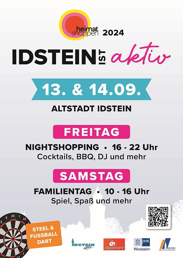 "Idstein ist aktiv" heißt es bei der diesjährigen Aktion "Heimat shoppen" in der Altstadt Idstein. Gemeinsam machen die Kooperationspartner Idstein aktiv, idsteincard, die IHK Wiesbaden und die Hochschulstadt Idstein das Shoppen am 13. und 14. September zum Erlebnis. Am Freitag steht von 16 bis 22 Uhr ein "Nightshopping" auf dem Programm, begleitet von Cocktails, BBQ, einem DJ und mehr. Am Samstag ist von 10 bis 16 Uhr Familientag mit vielen Mitmach-Aktionen. Die Veranstalter versprechen Spiel und Spaß für Groß und Klein.